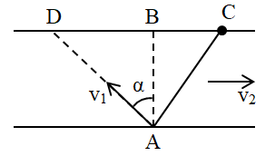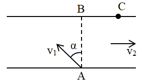Ở một đoạn sông thẳng, dòng nước chảy với vận tốc \({v_2}\) so với bờ. Một chiếc thuyền chuyển động đều có vận tốc so với nước luôn luôn là \({v_1}\). Nếu người lái hướng mũi thuyền theo B thì sau 10 phút, thuyền đến C về phía hạ lưu với \(BC = 120\,\,m\). Nếu người lái hướng mũi thuyền về phía thượng lưu theo góc lệch \(\alpha \) thì sau 12 phút 30 giây, thuyền đến B.