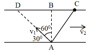 Một ca nô chạy qua sông xuất phát từ A, mũi hướng tới điểm B ở bờ bên kia. AB vuông góc với bờ sông. Nhưng do nước chảy nên khi đến bờ bên kia, ca nô lại ở cách B đoạn 240 m. Thời gian qua sông là 120 giây. Nếu người lái giữ cho mũi ca nô chếch \({30^0}\) so với bờ sông và mở máy chạy như trước thì ca nô chạy tới đúng điểm B. Tính: