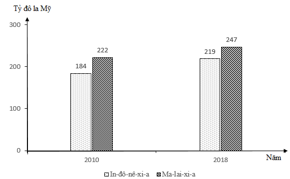 Cho biểu đồ:GIÁ TRỊ XUẤT KHẨU CỦA IN-ĐÔ-NÊ-XI-A VÀ MA-LAI-XI-A NĂM 2010 VÀ 2018(Số liệu theo