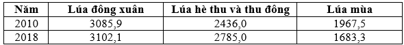 Cho bảng số liệu:DIỆN TÍCH LÚA PHÂN THEO MÙA VỤ CỦA NƯỚC TA NĂM 2010 VÀ NĂM 2018(Đơn vị: