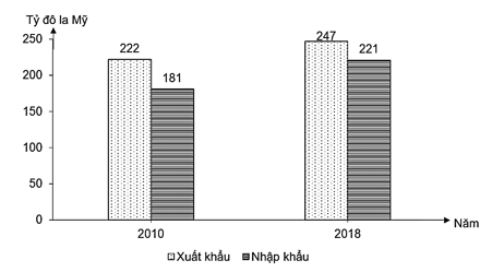 Theo biểu đồ, nhận xét nào sau đây đúng về giá trị xuất khẩu, nhập khẩu hàng hóa và dịch vụ của Ma-lai-xi-a năm 2018 so với năm 2010?