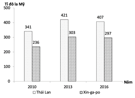 Cho biểu đồ:QUY MÔ GDP CỦA THÁI LAN VÀ XIN-GA-PO GIAI ĐOẠN 2010 - 2016Theo biểu đồ, nhận xét nào