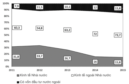 Theo biểu đồ, nhận xét nào sau đây đúng về sự thay đổi tỉ trọng trong cơ cấu doanh thu dịch vụ lữ hành phân theo thành phần kinh tế của nước ta, giai đoạn 2011 - 2015?