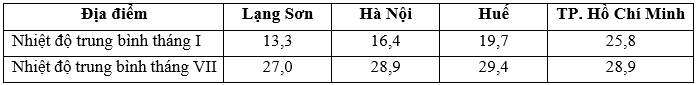 Cho bảng số liệu:NHIỆT ĐỘ TRUNG BÌNH TẠI MỘT SỐ ĐỊA ĐIỂM(Đơn vị: 0C)Theo bảng số