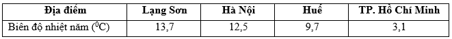 Theo bảng số liệu, địa điểm có biên độ nhiệt năm lớn nhất là