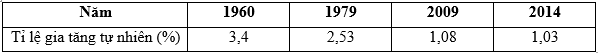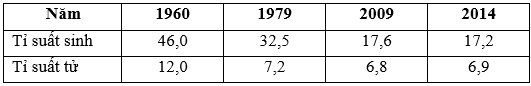Cho bảng số liệu:TỈ SUẤT SINH VÀ TỈ SUẤT TỬ CỦA NƯỚC TA GIAI ĐOẠN 1960 - 2014(Đơn vị: