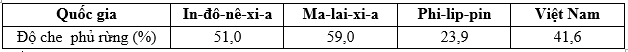Theo bảng số liệu, nhận xét nào sau đây đúng khi so sánh độ che phủ rừng năm 2011 của các quốc gia?