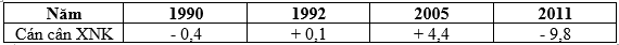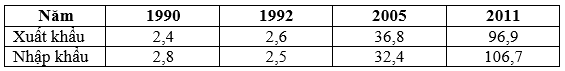 Cho bảng số liệu:GIÁ TRỊ XUẤT, NHẬP KHẨU CỦA NƯỚC TA GIAI ĐOẠN 1990 – 2011(Đơn vị: Tỉ