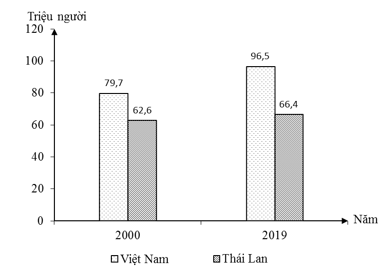 Cho biểu đồ:SỐ DÂN CỦA VIỆT NAM VÀ THÁI LAN NĂM 2000 VÀ NĂM 2019Theo biểu đồ, nhận xét nào