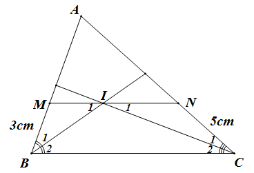 Cho \(\Delta ABC\), các tia phân giác góc B và C cắt nhau tại điểm I. Qua I kẻ đường thẳng song song với BC cắt AB tại M, cắt AC tại N. Biết rằng \(BM = 3cm\), \(CN = 5cm\). Độ dài MN là: