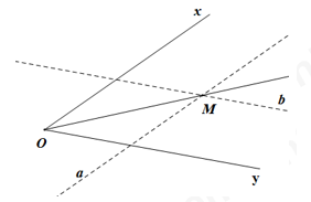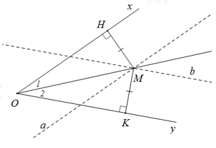 Cho góc xOy khác góc bẹt. Gọi h là khoảng cách giữa 2 lề song song của một thước thẳng. Áp một lề trùng với \(Ox\), vẽ đường thẳng a theo lề kia. Lại áp một lề thước trùng với \(Oy\), vẽ đường thẳng b theo lề kia. Đường thẳng a cắt đường thẳng b ở M. Chứng minh: OM là tia phân giác của góc xOy.
