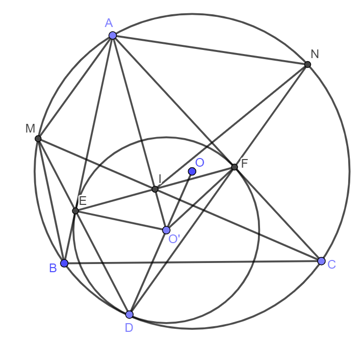 2) Vẽ đường tròn \(\left( {O'} \right)\) tiếp xúc với \(\left( O \right)\) tại \(D\) và tiếp xúc với \(AB,AC\) lần lượt tại \(E,F.\)