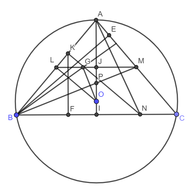 a) Gọi \(O\) là tâm đường tròn ngoại tiếp tam giác \(ABC.\) Chứng minh \(OG \bot BM\).
