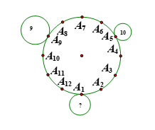 Trên mỗi đỉnh của một đa giác có \(12\) cạnh người ta ghi \(1\) số, mỗi số trên một đỉnh là tổng của hai đỉnh liền kề. Biết hai số ở hai đỉnh \({A_5}\) và \({A_9}\) là \(10\)và \(9\). Tìm số đỉnh ở \({A_1}\).