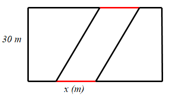 Trong một khu vườn hình chữ nhật, bác Xuân dự định làm một lối đi cát sỏi với các kích thước như hình vẽ. Chi phí cho mỗi mét vuông làm lối đi là \(150000\) đồng và bác Xuân có tất cả \(12000000\) đồng để phục vụ cho việc làm lối đi trên. Hỏi chiều rộng tối đa của lối đi (độ dài \(x\) ) trên hình vẽ là bao nhiêu mét? Biết \(x\) là một số nguyên dương. Khi đó bác Xuân còn lại bao nhiêu tiền?