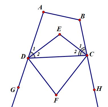 Cho tứ giác \(ABCD\) có \(\widehat A + \widehat B = {200^0}\). Các tia phân giác của các góc \(\widehat C,\widehat D\) cắt nhau tại \(E\), các tia phân giác của các góc ngoài tại các đỉnh \(C,D\) cắt nhau tại \(F.\) Tính \(\widehat {CED},\widehat {CFD}.\)
