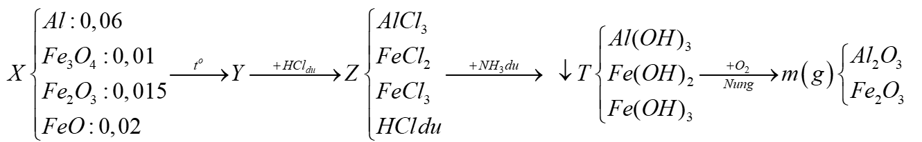 Đun nóng hỗn hợp bột X gồm 0,06 mol Al; 0,01 mol Fe3O4; 0,015 mol Fe2O3 và 0,02 mol FeO một thời gian. Hỗn hợp Y thu được sau phản ứng được hoà tan hoàn toàn vào dung dịch HCl dư, thu được dung dịch Z. Thêm NH3 vào Z cho đến dư, lọc lấy kết tủa T rồi đem nung ngoài không khí đến khối lượng không đổi thu được m gam chất rắn. Giá trị của m là