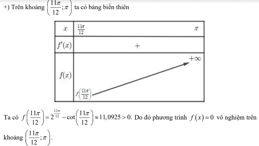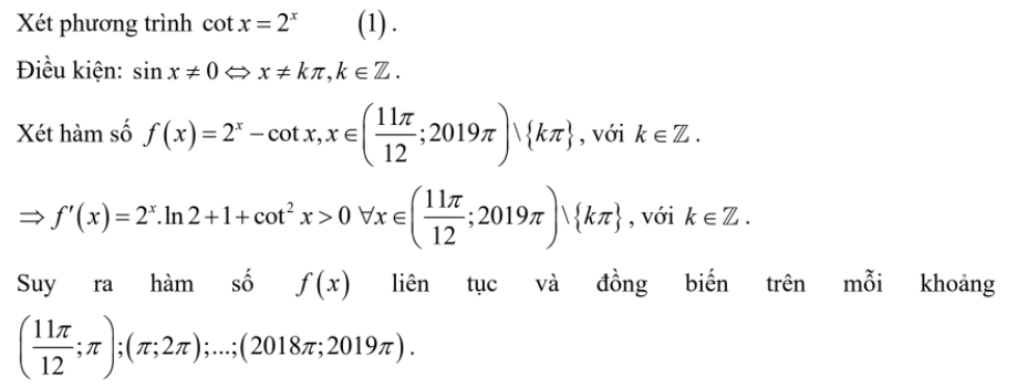 Tính số nghiệm của phương trình \(\cot x = {2^x}\) trong khoảng \(\left( {\dfrac{{11\pi }}{{12}};2019\pi }