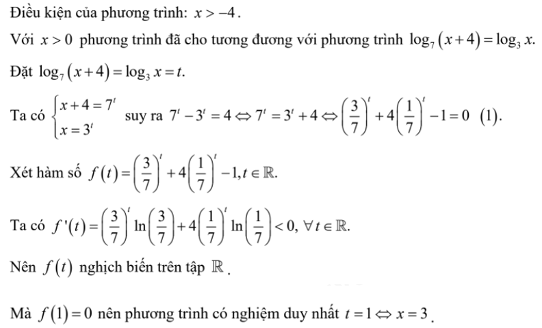 Số nghiệm của phương trình \({3^{{{\log }_7}\left( {x + 4} \right)}} = x\) là