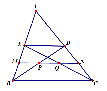 Cho tam giác \(ABC\) có \(BC = 4cm\). Gọi \(D,E\) theo thứ tự là trung điểm của \(AC,AB;M\) và \(N\) theo thứ tự là trung điểm của \(BE\) và \(CD.MN\) cắt \(BD\) ở \(P\), cắt \(CE\) tại \(Q\).