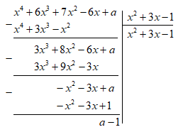 Xác định hệ số \(a\) để đa thức \(\left( {{x^4} + 6{x^3} + 7{x^2} - 6x + a} \right)\) chia hết cho \(\left( {{x^2} + 3x - 1} \right)\).