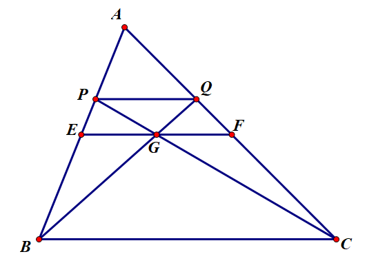 Cho tam giác \(ABC,PQ//BC\) với \(P,Q\) là các điểm tương ứng thuộc \(AB\) và \(AC.\) Đường thẳng \(PC\) và \(QB\) cắt nhau tại \(G.\) Đường thẳng đi qua \(G\) và song song với \(BC\) cắt \(AB\) tại \(E\) và \(AC\) tại \(F.\) Biết \(PQ = a,EF = b.\) Tính độ dài đoạn \(BC.\)