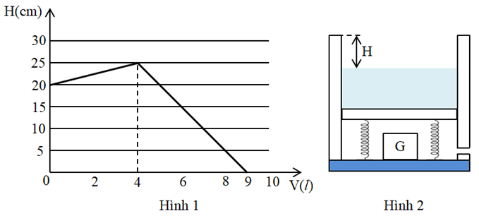 Một thùng nước có thành thẳng đứng được đặt trong một công viên khoa học dành cho các bạn yêu thích khám phá. Bạn Khôi thực hiện thí nghiệm theo hướng dẫn: đổ thêm nước vào thùng và quan sát mực nước trong thùng. Khoảng cách H từ miệng thùng đến mặt thoáng của nước phụ thuộc vào thể tích V của nước đổ thêm vào thùng tuân theo một quy luật đặc biệt được biểu diễn như đồ thị Hình 1. Khôi phát hiện ra đáy thùng là một chiếc pit-tông được đỡ bởi một hệ lò xo và có thể dịch chuyển thẳng đứng không ma sát trong thùng. Phía dưới đáy thùng có một giá G nhằm tránh cho lò xo bị nén quá mức (Hình 2). Biết rằng, khi hệ lò xo bị nén tới chiều dài l thì sinh ra một lực đẩy là \(F = k\left( {{l_0} - l} \right)\) với k và \({l_0}\) là các hằng số. Cho khối lượng riêng của nước là \(D = 1000\,\,kg/{m^3}\). Tính diện tích S của pít-tông và hệ số k.