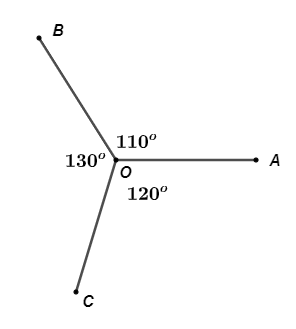 Cho ba tia \(OA,OB,OC\) sao cho \(\widehat {AOB} = 110^\circ ,\widehat {BOC} = 130^\circ ,\widehat {COA} = 120^\circ \). Hỏi tia nào nằm giữa hai tia còn lại?