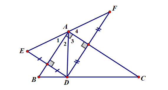 Cho tam giác \(ABC\) vuông tại \(A\), điểm \(D\) thuộc cạnh \(BC\). Gọi \(E\) là điểm đối xứng với \(D\) qua \(AB\), gọi \(F\) là điểm đối xứng với \(D\) qua \(AC\). Chứng minh rằng các điểm \(E\) và \(F\) đối xứng nhau qua điểm \(A.\)