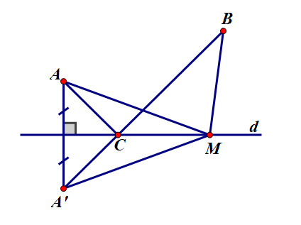 Cho hai điểm \(A,B\) cùng thuộc một nửa mặt phẳng có bờ là đường thẳng \(d\) (\(AB\) không vuông góc với \(d\)). Gọi \(A'\) là điểm đối xứng với \(A\) qua \(d\), \(C\) là giao điểm của \(A'B\) và \(d\). Gọi \(M\) là điểm bất kì khác \(C\) thuộc đường thẳng \(d\). Chứng minh rằng: \(AC + CB < AM + MB.\)