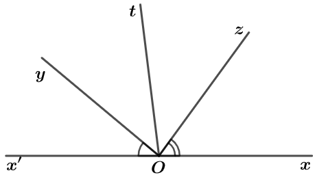 Trên đường thẳng \(xx'\) lấy một điểm \(O\). Trên cùng nửa mặt phẳng bờ là đường thẳng \(xx'\) vẽ ba tia \(Oy,\,\,Ot,\,\,Oz\) sao cho: \(\angle x'Oy = {40^0},\,\,\angle xOt = {97^0},\,\,\angle xOz = {54^0}\) .