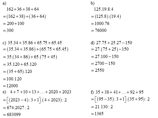 Tính nhanh:a) \(162 + 36 + 38 + 64\) b) \(125.19.8.4\)c) \(35.34 + 35.86 + 65.75 +