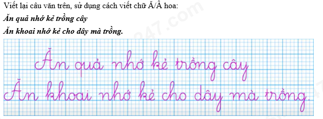 Viết lại câu văn sau bằng chữ Ă/Â viết hoa: Ăn quả nhớ kẻ trồng cây Ăn khoai nhớ kẻ cho