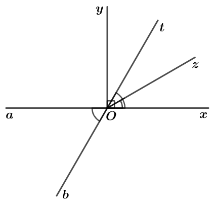 Trên cùng một nửa bờ mặt phẳng bờ chứa tia \(Ox\), vẽ ba tia \(Oy,\,\,Oz,\,\,Ot\) sao cho \(\angle xOz = {30^0},\,\,\angle xOt = {60^0},\,\,\angle xOy = {90^0}\).