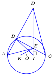 Cho tam giác \(ABC\,\,\left( {AB < BC} \right)\) nội tiếp trong đường tròn \(\left( O \right)\) đường kính \(AC\). Gọi \(I\) là một điểm thuộc đoạn \(OC\) (\(I\) khác \(O\) và \(C\)). Qua \(I\) kẻ đường vuông góc với \(AC\) cắt \(BC\) tại \(E\) và \(AB\) kéo dài tại \(D\). Gọi \(K\) là điểm đối xứng của \(C\) qua điểm \(I\).