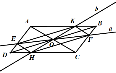 Cho hình bình hành \(ABCD\), gọi \(O\) là giao điểm của hai đường chéo \(AC\) và \(BD\).Qua \(O\) vẽ đường thẳng \(a\) cắt hai đường thẳng \(AD,BC\) lần lượt tại \(E,F\). Qua \(O\) vẽ đường thẳng \(b\) cắt \(AB,CD\) tại \(K,H\). Chứng minh \(EKFH\) là hình bình hành.