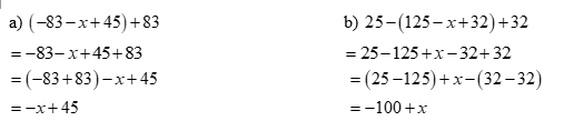 Rút gọn biểu thức: a) \(\left( { - 83 - x + 45} \right) + 83\) b) \(25 - \left( {125 - x + 32} \right) +
