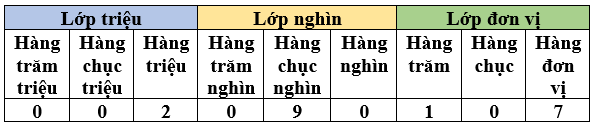 Số đó gồm 2 triệu, 9 chục nghìn, 1 trăm và 7 đơn vị. Số đó là: