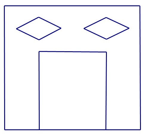 Ông An muốn quét sơn một bức tường hình vuông (như hình vẽ) có độ dài cạnh là \(6m\). Biết rằng hai cửa sổ hình thoi có độ dài hai đường chéo lần lượt là \(2m\);\(3m\) và một cửa ra vào hình chữ nhật có chiều dài và chiều rộng lần lượt là \(5m\);\(4m\). Tính diện tích bức tường ông An cần quét sơn (không quét sơn cửa sổ và cửa ra vào)?
