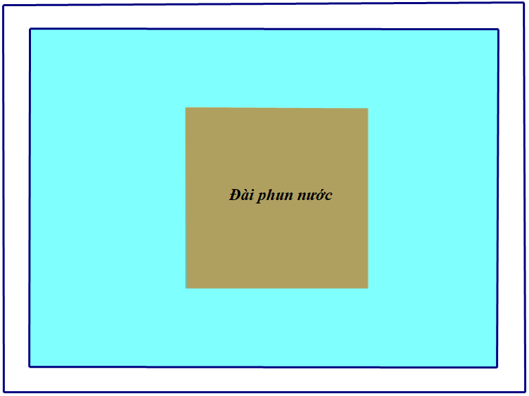 Một mảnh đất hình chữ nhật có chiều dài \(20m\) và chiều rộng \(15m\) được thiết kế làm hồ hoa sen (như hình vẽ). Người ta làm lối đi xung quanh hồ hoa sen có độ rộng \(1m\). Giữa hồ người ta làm một đài phun nước hình vuông có độ dài cạnh là \(5m\). Tính diện tích hồ hoa sen.