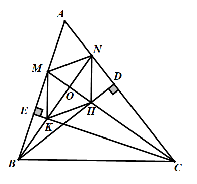 Cho tam giác \(ABC\) nhọn, các đường cao \(BD,CE\). Tia phân giác của các \(\angle ABD\) và \(\angle ACE\) cắt nhau tại \(O\), cắt \(AC\) và \(AB\) lần lượt tại \(N\) và \(M\). Tia \(BN\) cắt \(CE\) tại \(K\), tia \(CM\) cắt \(BD\) tại \(H\). Chứng minh rằng: