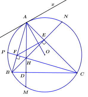 Cho tam giác \(ABC\) có ba góc nhọn, nội tiếp trong đường tròn \(\left( {O;R} \right)\) và hai đường cao \(BE,CF\) cắt nhau tại \(H\).