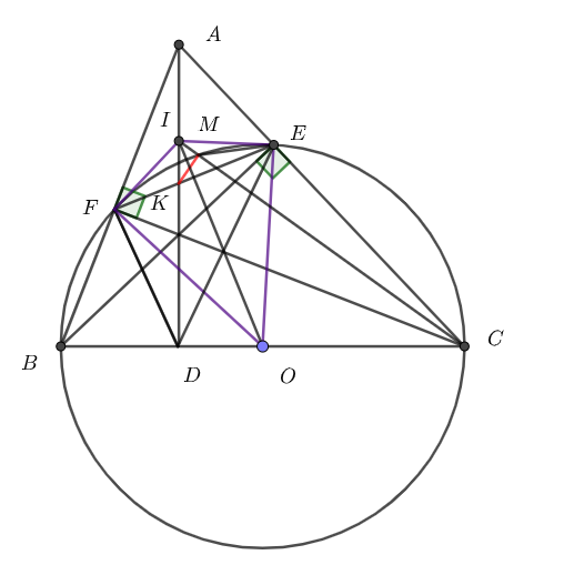 b) + 5 điểm \(I,F,D,O,E\) cùng thuộc đường tròn đường kính \(IO\), suy ra \(\angle KFI = \angle IDF\)