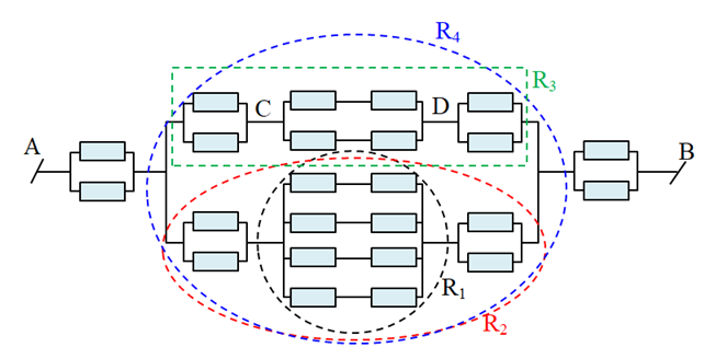 Cho mạch điện như hình vẽ. Điện trở mỗi cạnh của hình vuông là R. Tính điện trở giữa hai điểm:
