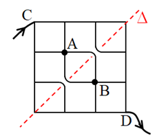 Cho mạch điện như hình vẽ. Điện trở mỗi cạnh của hình vuông là R. Tính điện trở giữa hai