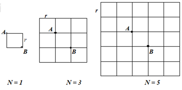 Điện trở là loại linh kiện phổ biến trong mạng lưới điện cũng như các mạch điện tử. Thông thường tùy vào mục đích ứng dụng, các điện trở có thể được tạo thành các mạch điện có hình dạng và kích thước khác nhau cùng với các linh kiện khác. Tuy nhiên trong bài này ta xét mạng điện chỉ bao gồm điện trở. Trên hình vẽ là các mạng điện trở hình vuông với kích cỡ \(N = 1;\,\,3;\,\,5\). Mỗi cạnh của hình vuông nhỏ có điện trở r như minh họa trên hình vẽ. Tính điện trở tương đương \({R_{AB}}\) đối với mạng điện trở hình vuông với kích cỡ lần lượt là \(N = 1;\,\,3;\,\,5\).