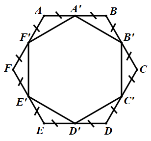Cho lục giác đều \(ABCDEF\). Gọi \(A',B',C',D',E',F'\) lần lượt là trung điểm của các cạnh