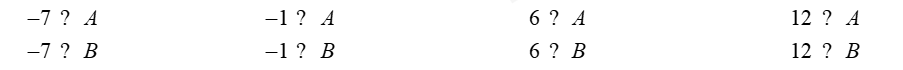 Cho tập hợp \(A\) gồm các số nguyên lớn hơn \( - 12\) và nhỏ hơn \(8\), tập hợp \(B\) gồm các số nguyên dương không lớn hơn \(15\). Điền kí hiệu \( \in ; \notin \) vào ô trống?