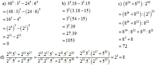 Tính giá trị của các biểu thức sau:a) \({48^3}:{3^3} - {24^6}:{6^6}\) b) \({3^4}.18 - {3^3}.15\)c)