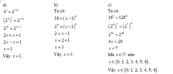 Tìm \(x \in \mathbb{N}\), biết: a) \({4^x}\; = {2^{x + 1}}\) b) \(16 = {\left( {x - 1}